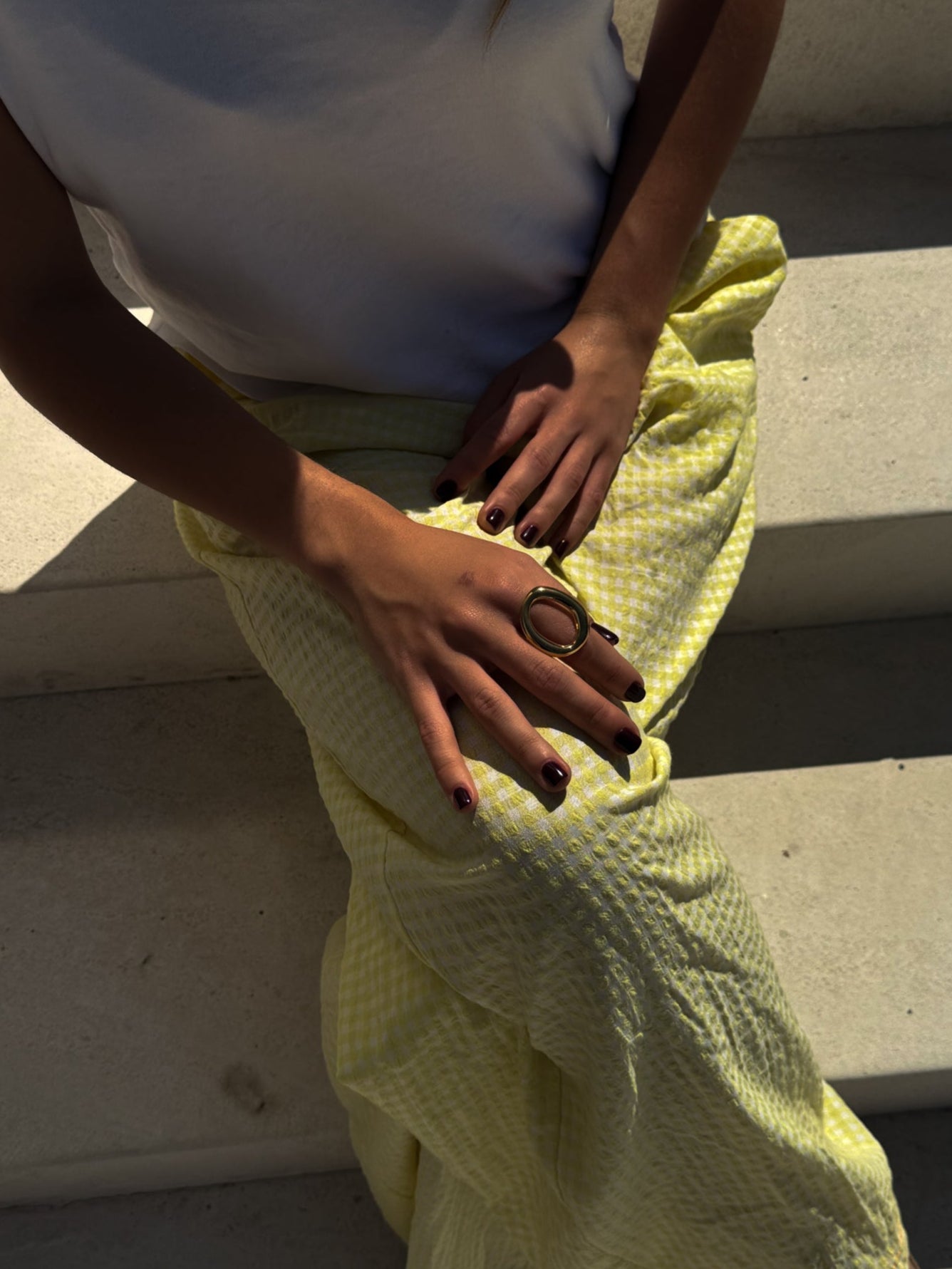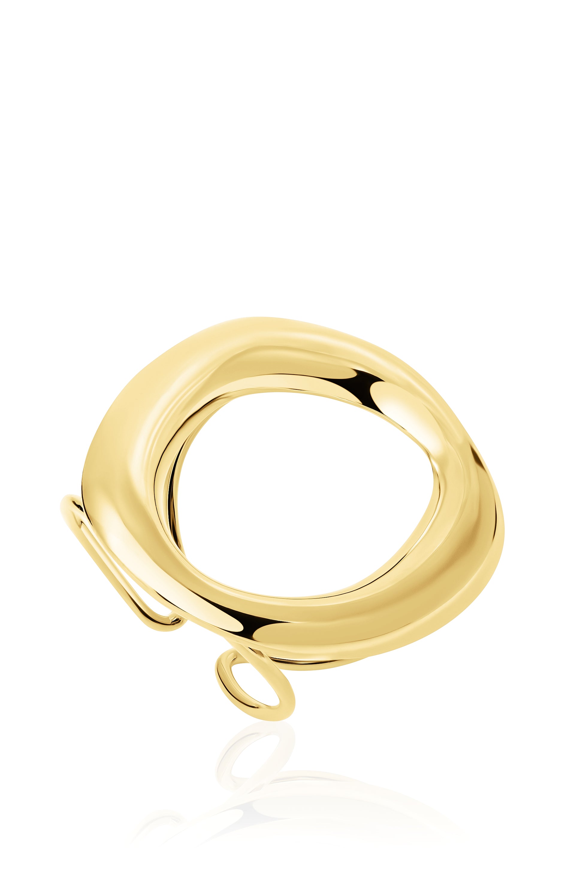 Anillo de acero inoxidable bañado en oro, ajustable con un diseño en forma de aro. Se adapta cómodamente a cualquier tamaño de dedo.