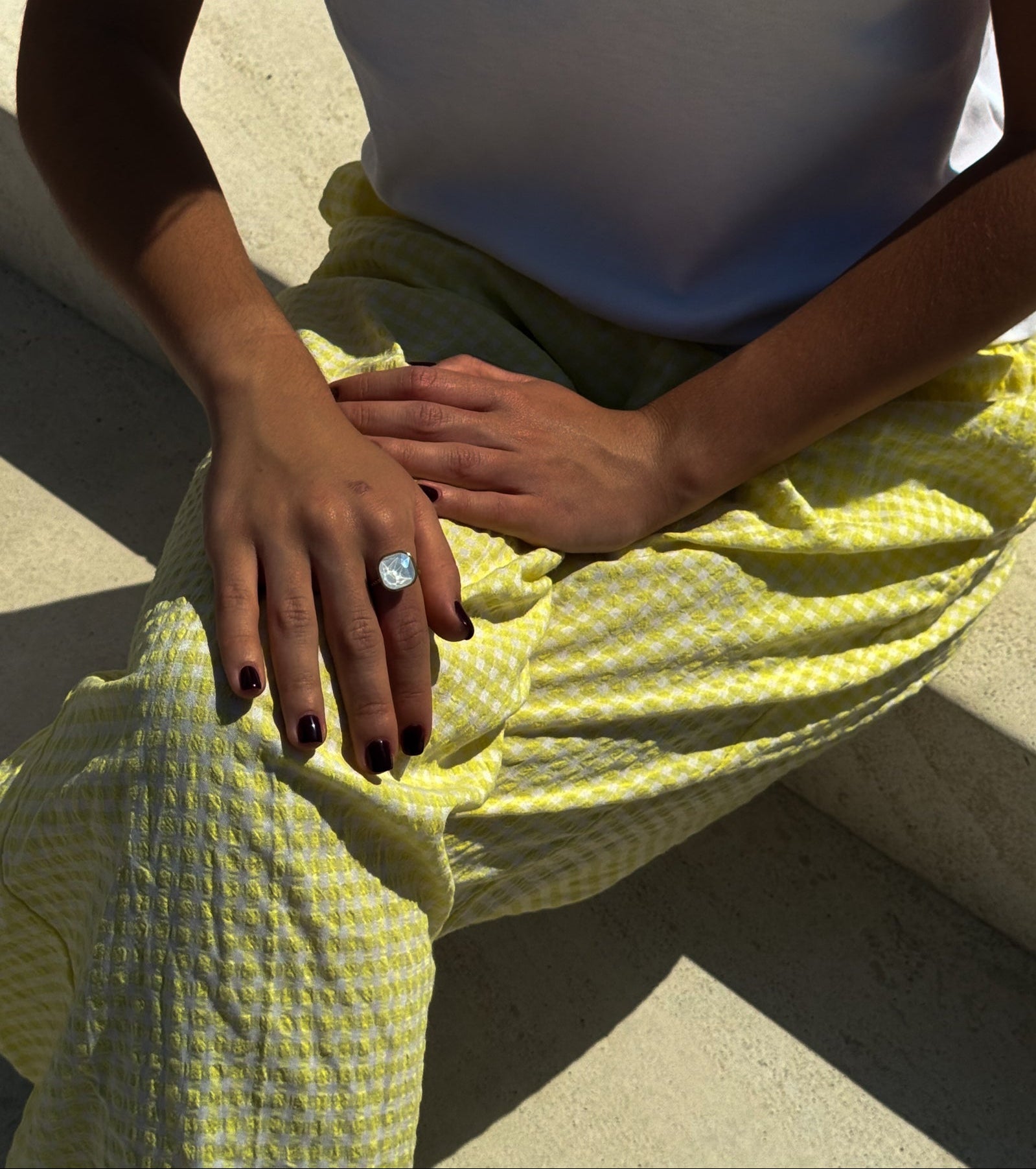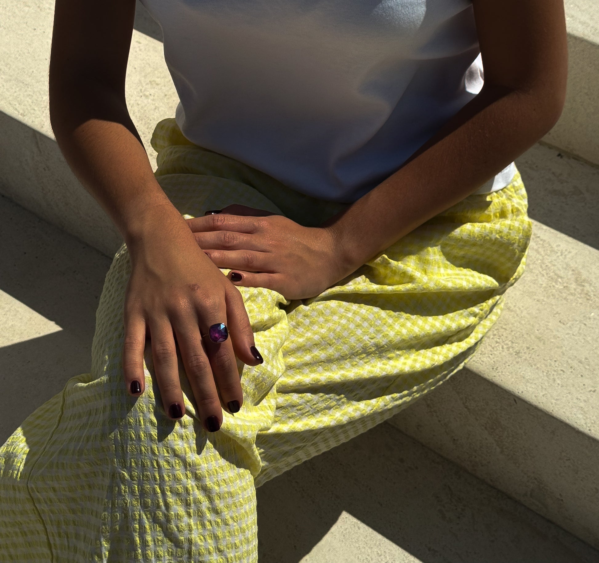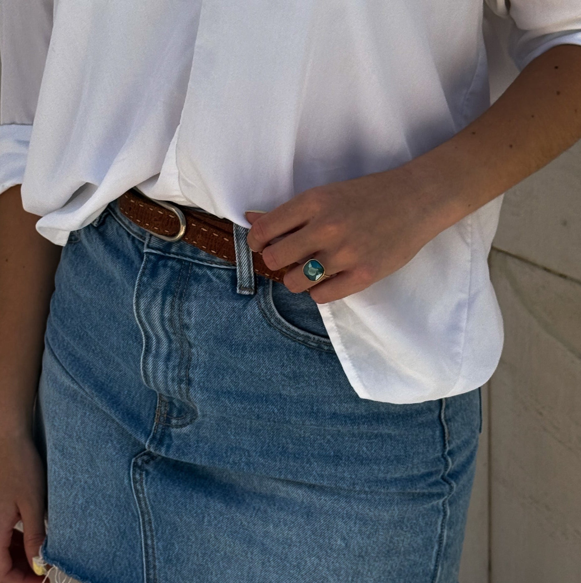 Anillo de acero inoxidable sobre una banda ajustable con diseño trenzado y acabado dorado.