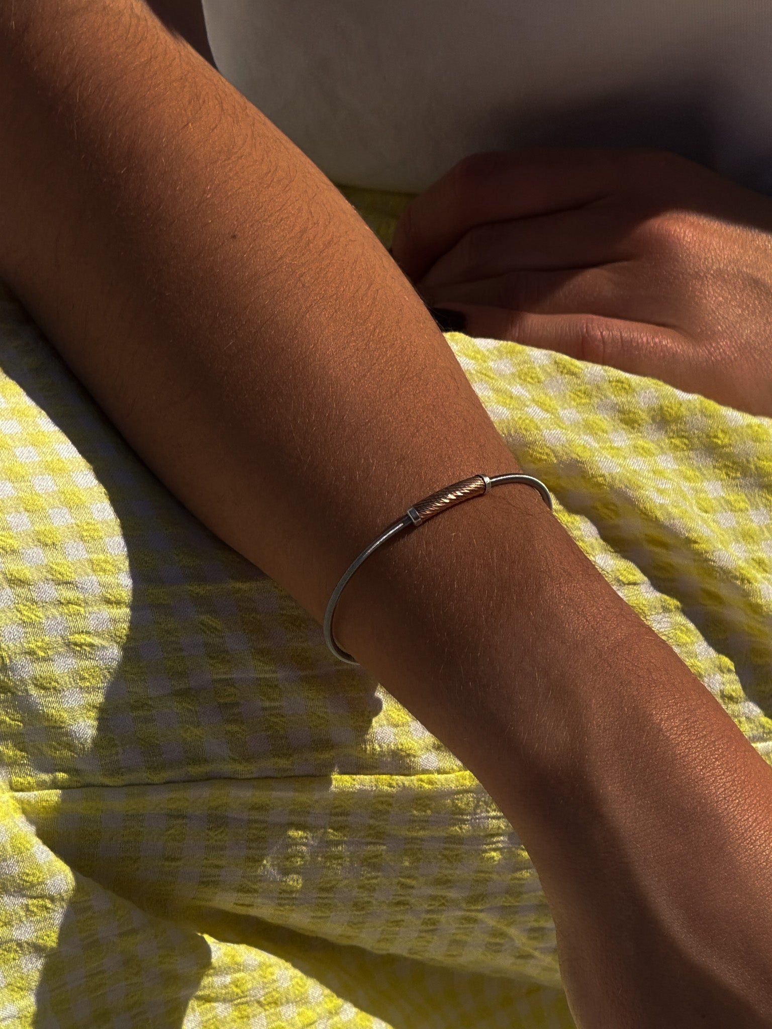 Pulseras de acero inoxidable combinadas con pieza de plata de ley tubular de diferentes colores.