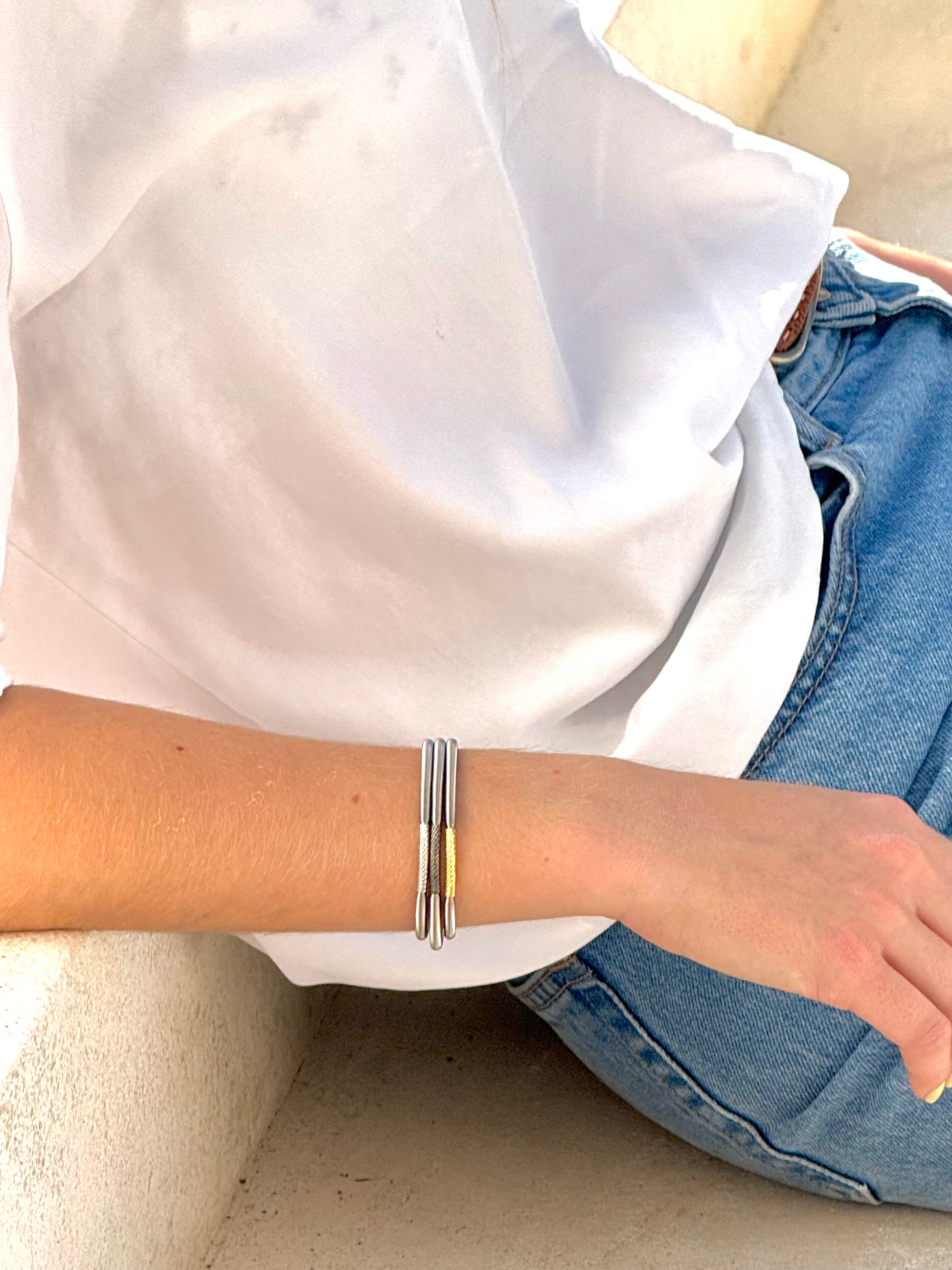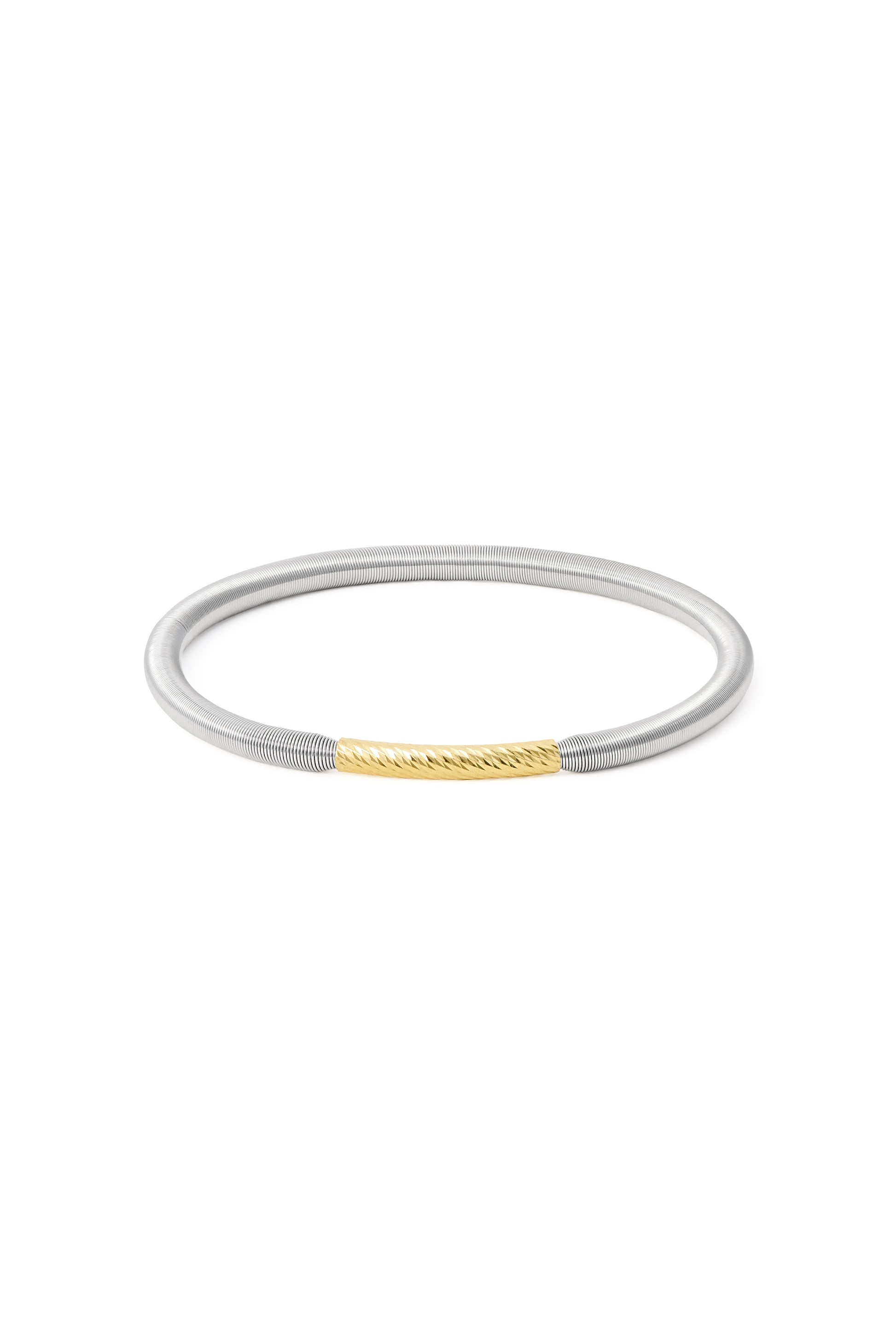 Pulsera de acero inoxidable elástica con pieza de plata de ley en varios colores.