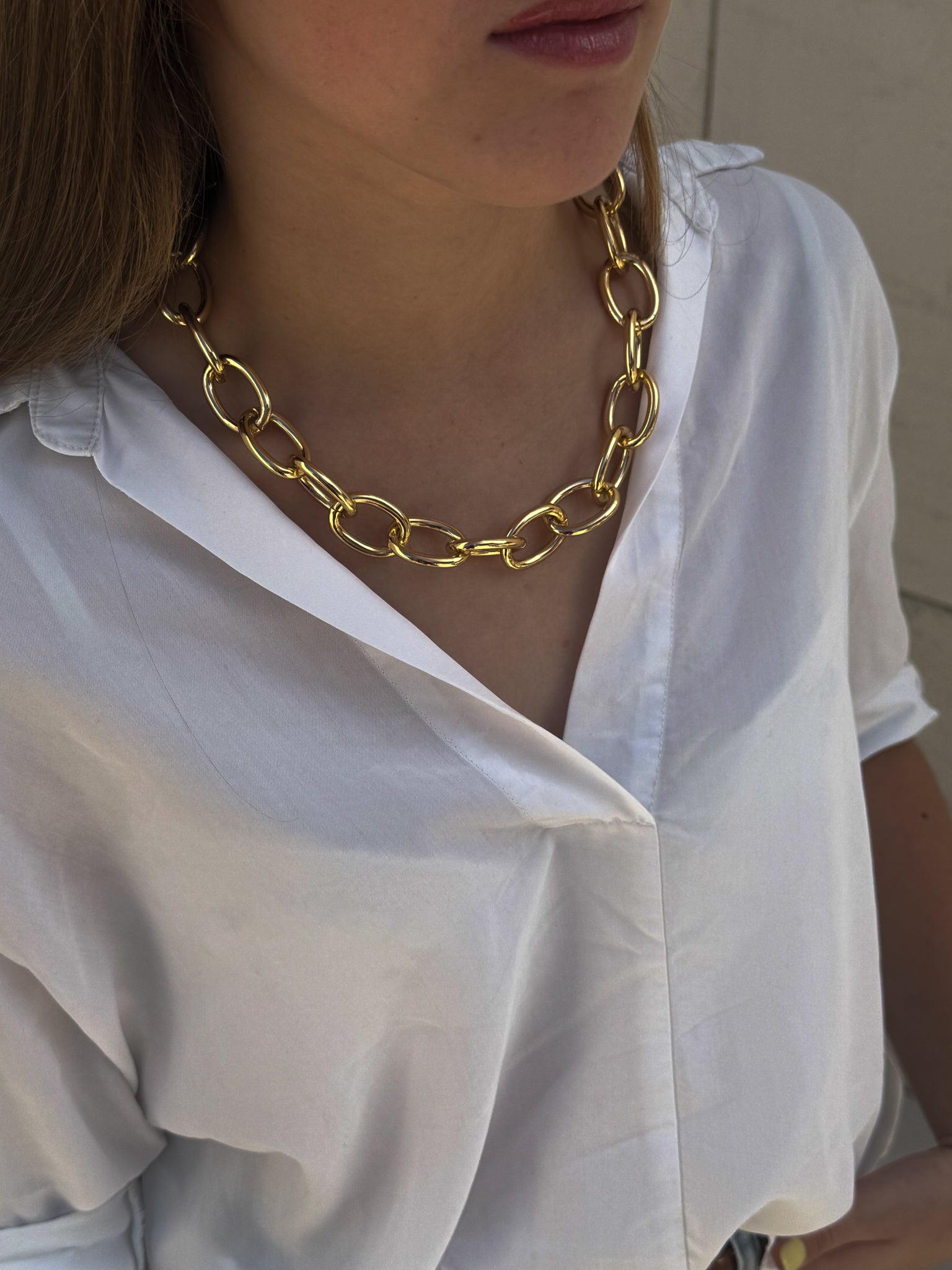 Cadena de acero inoxidable de eslabones grandes con acabado dorado.