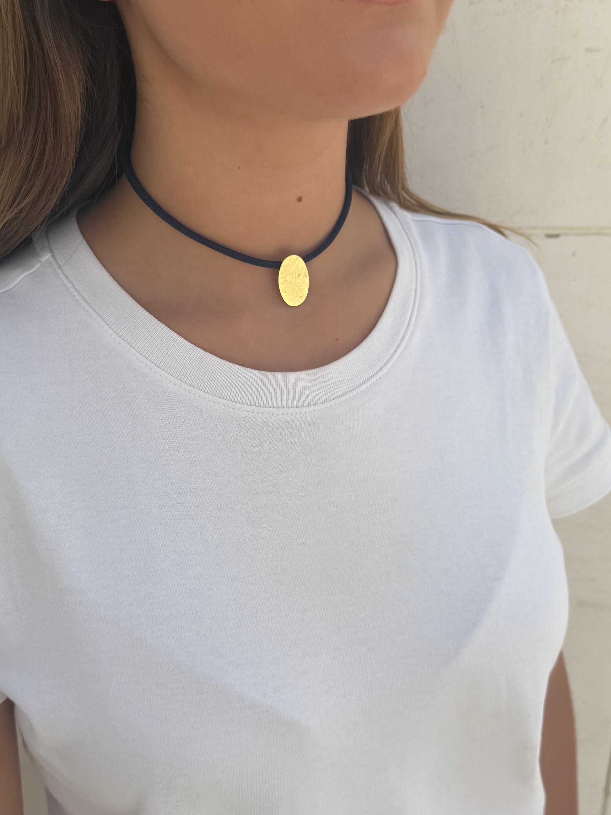 Collar elástico con pieza ovalada de zamak antialérgico fabricado con técnicas artesanales, con un diseño que combina elegancia y modernidad.