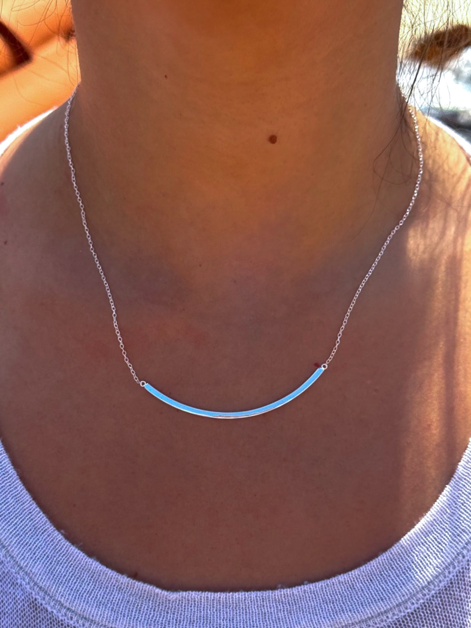 Cadena fina de plata de ley con pieza arqueada como colgante.
