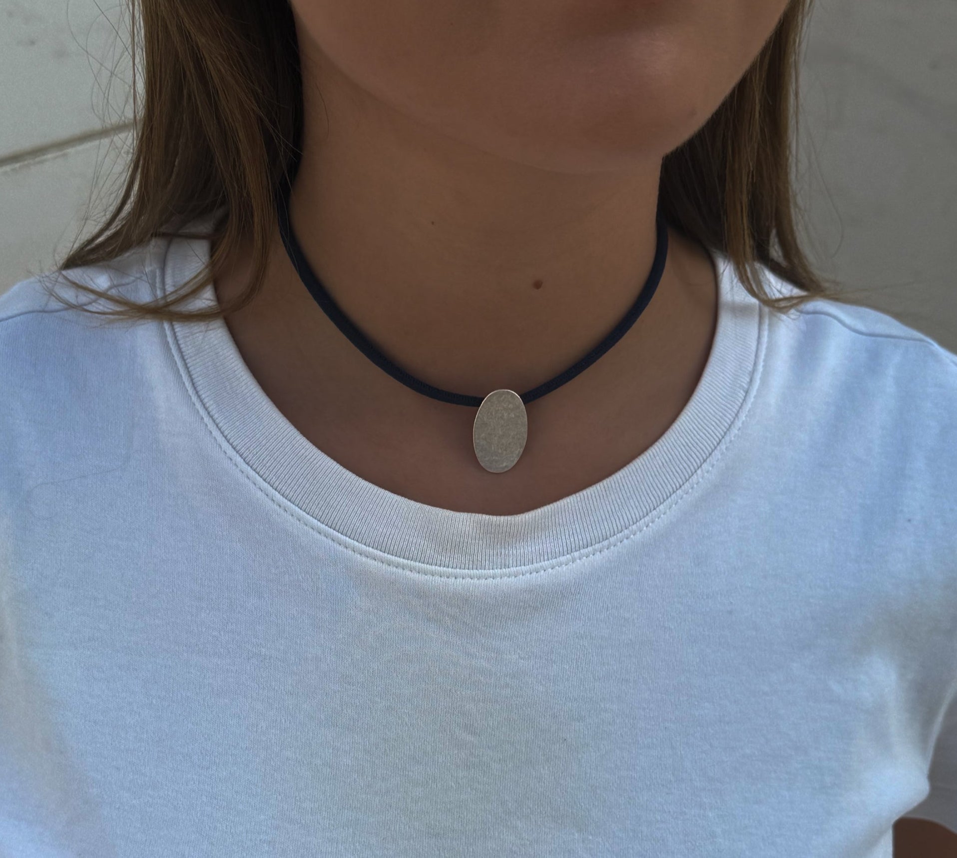 Collar con pieza de zamak antialérgico fabricado con técnicas artesanales, con un diseño que combina elegancia y modernidad.