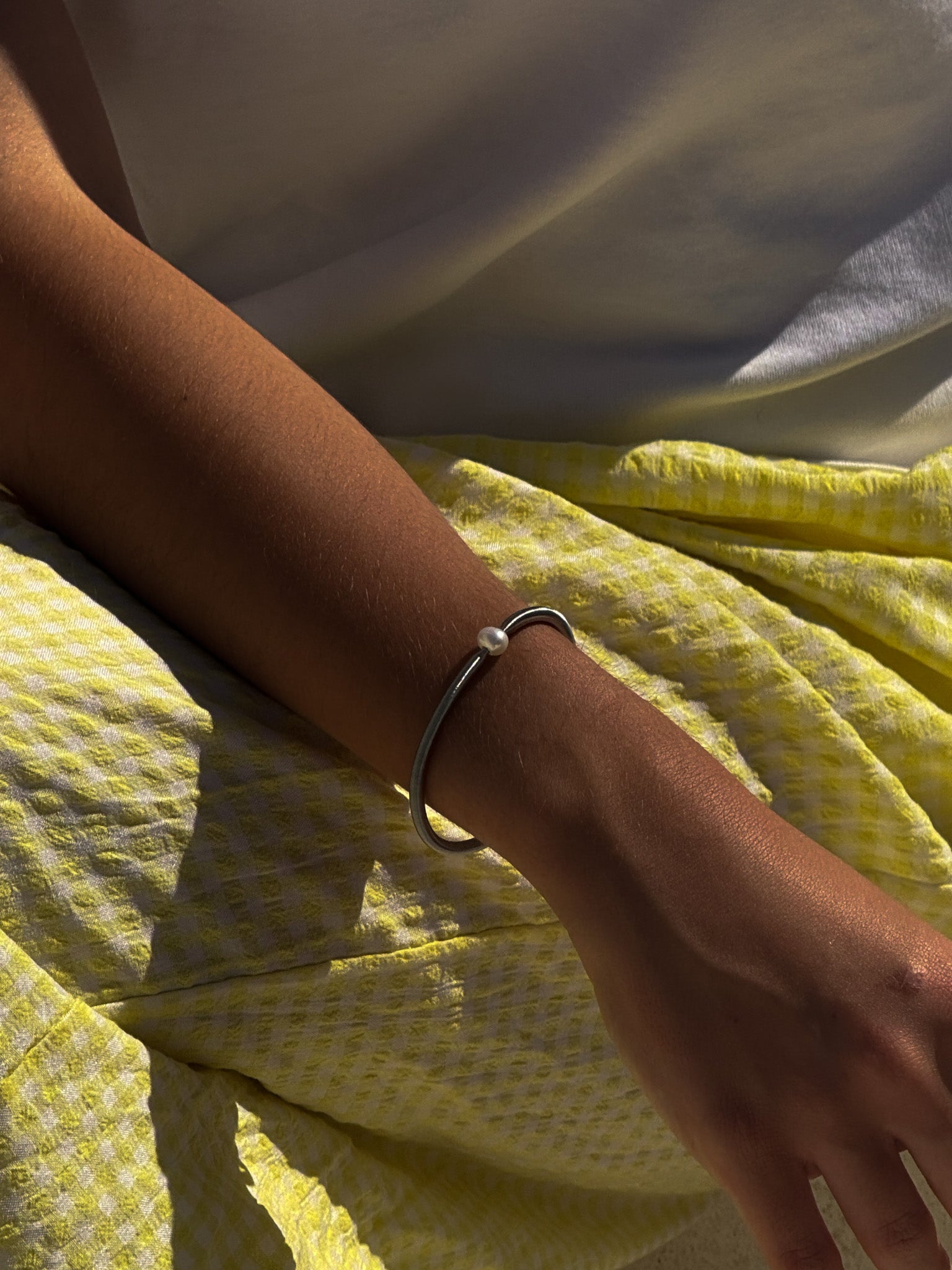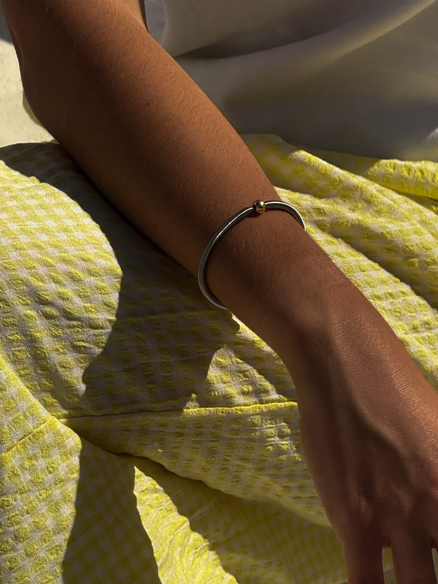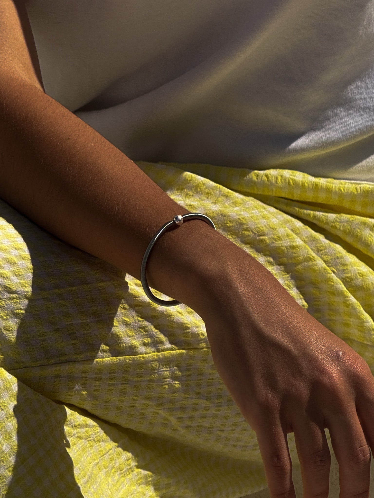Pulsera de acero elástica con pieza esférica de plata centrada en diferentes colores.