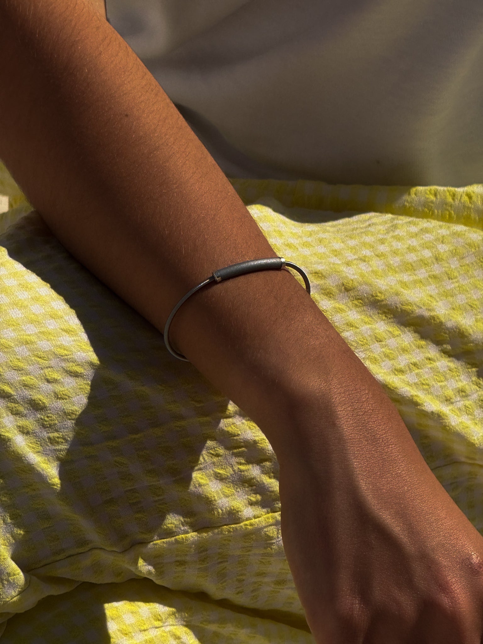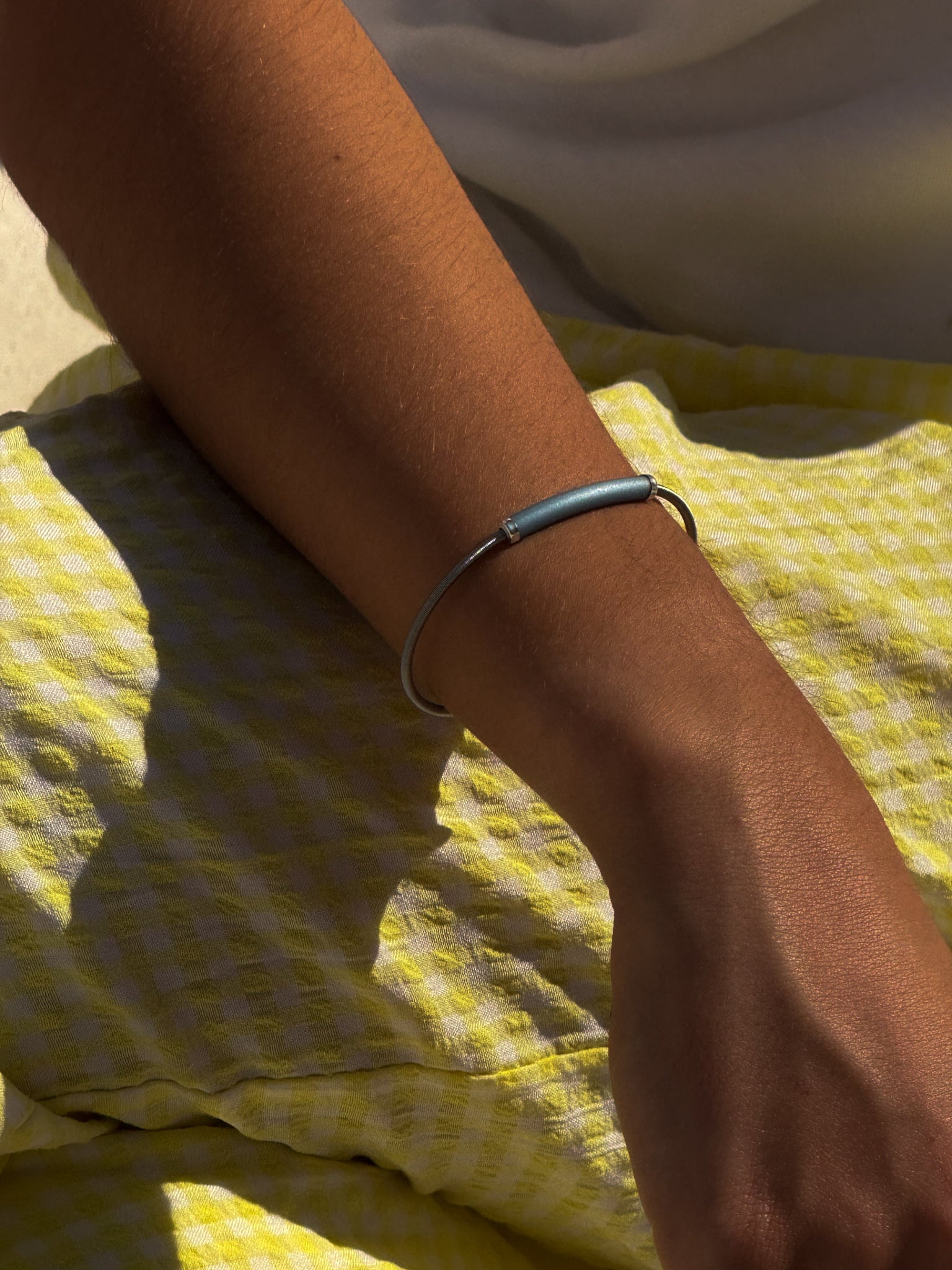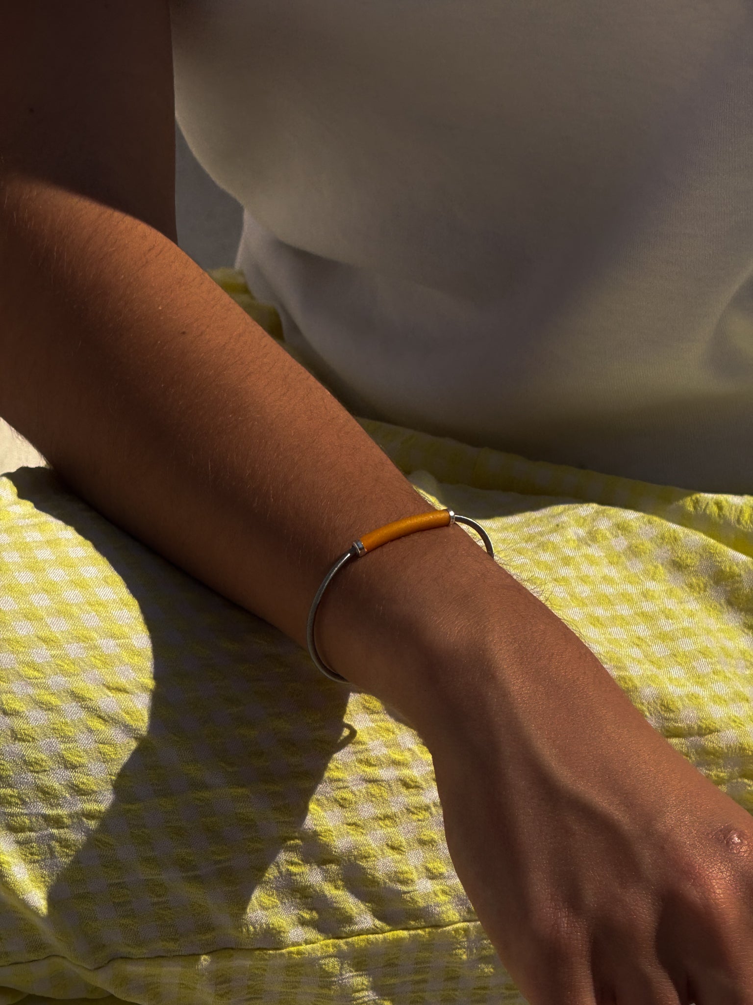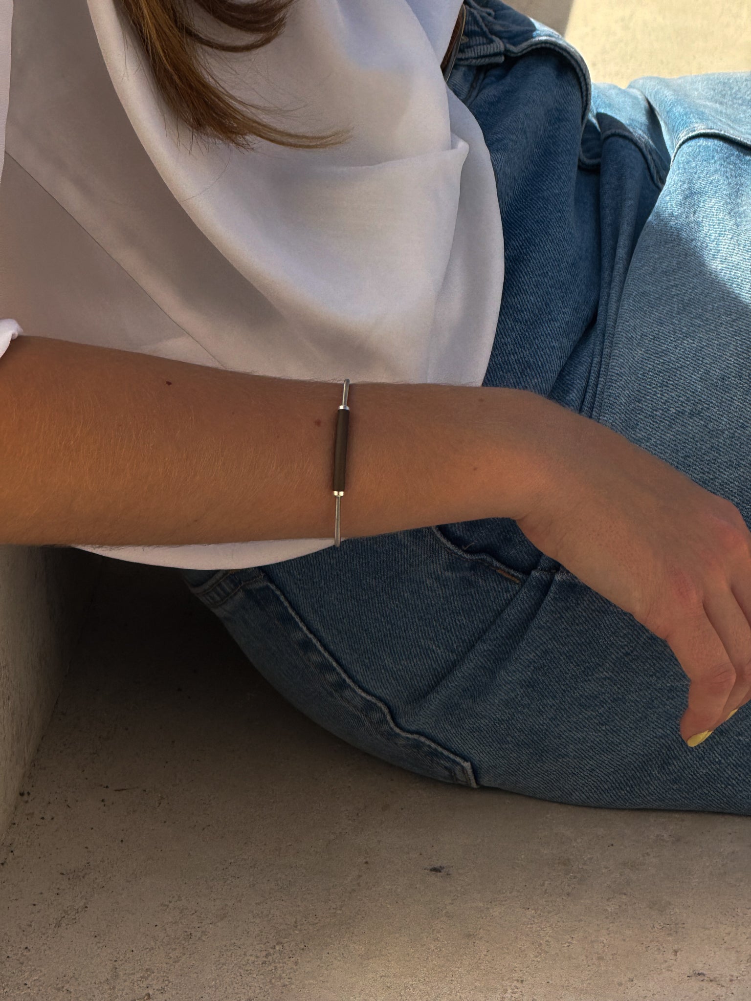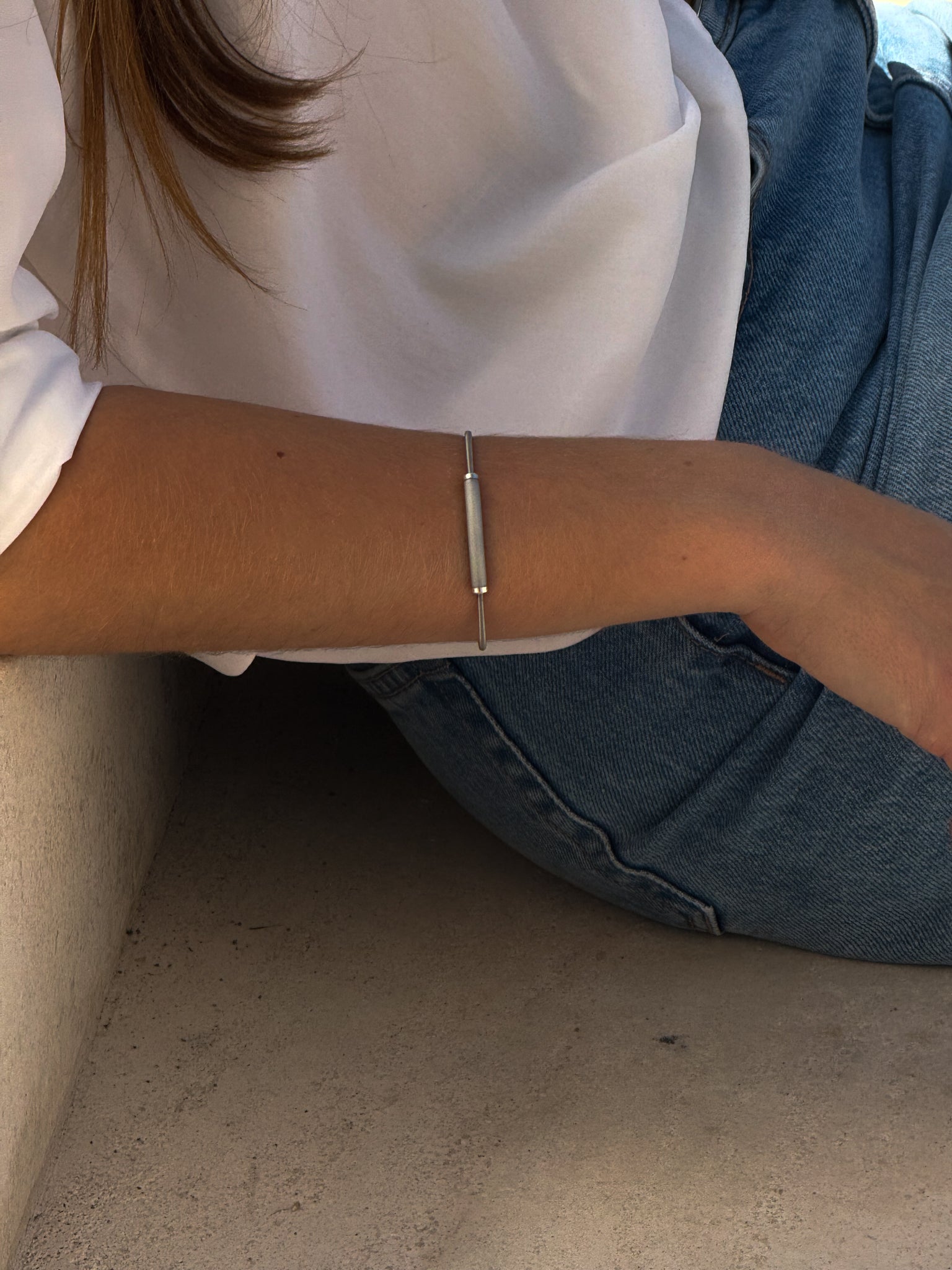 Pulsera de acero ajustable, con pieza de caucho cilíndrica en varios colores. Terminales de plata de ley.
