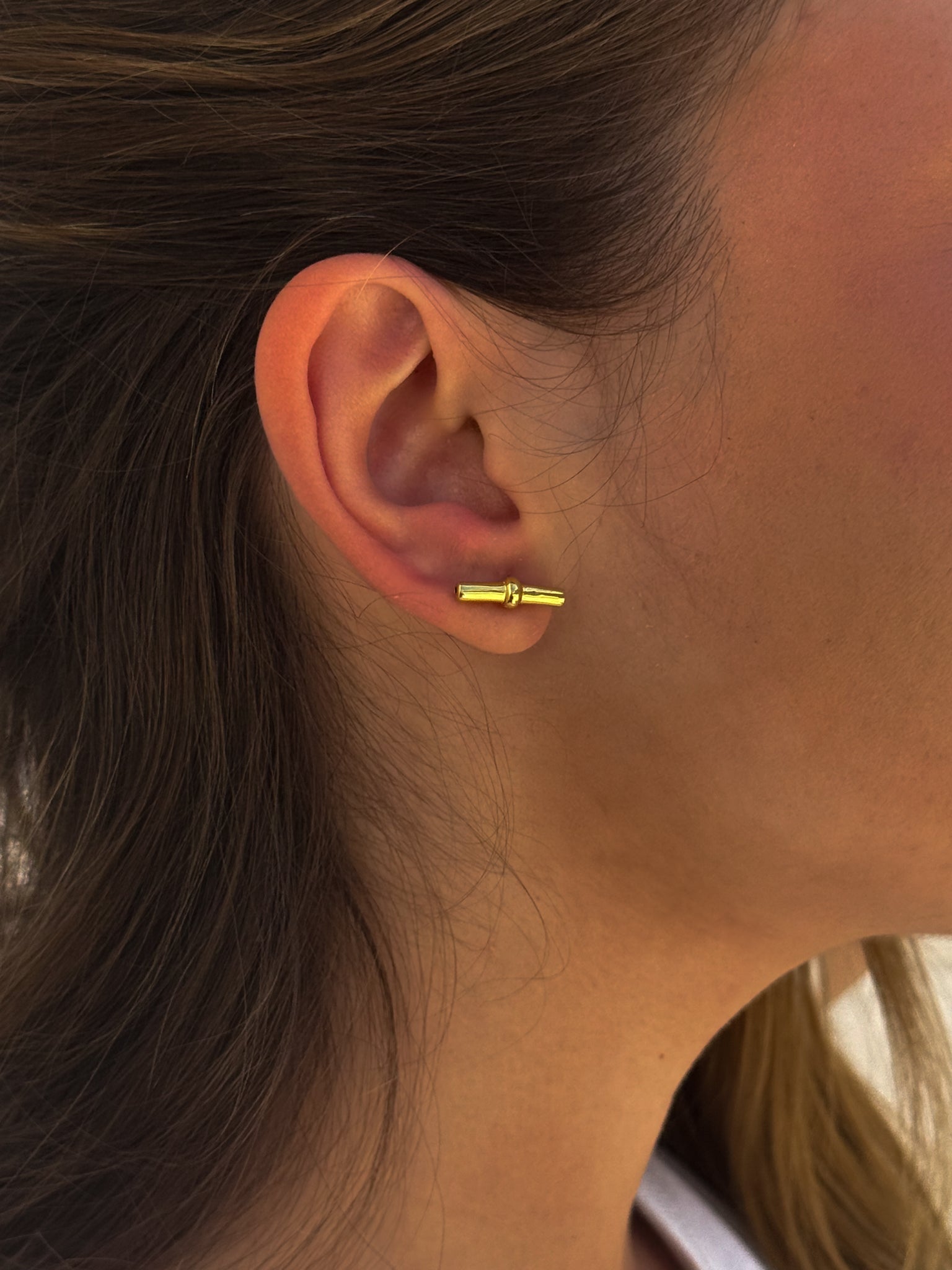 Pendiente de plata de ley bañado en oro con forma cilíndrica y pulido brillante. Un básico moderno para el día a día.