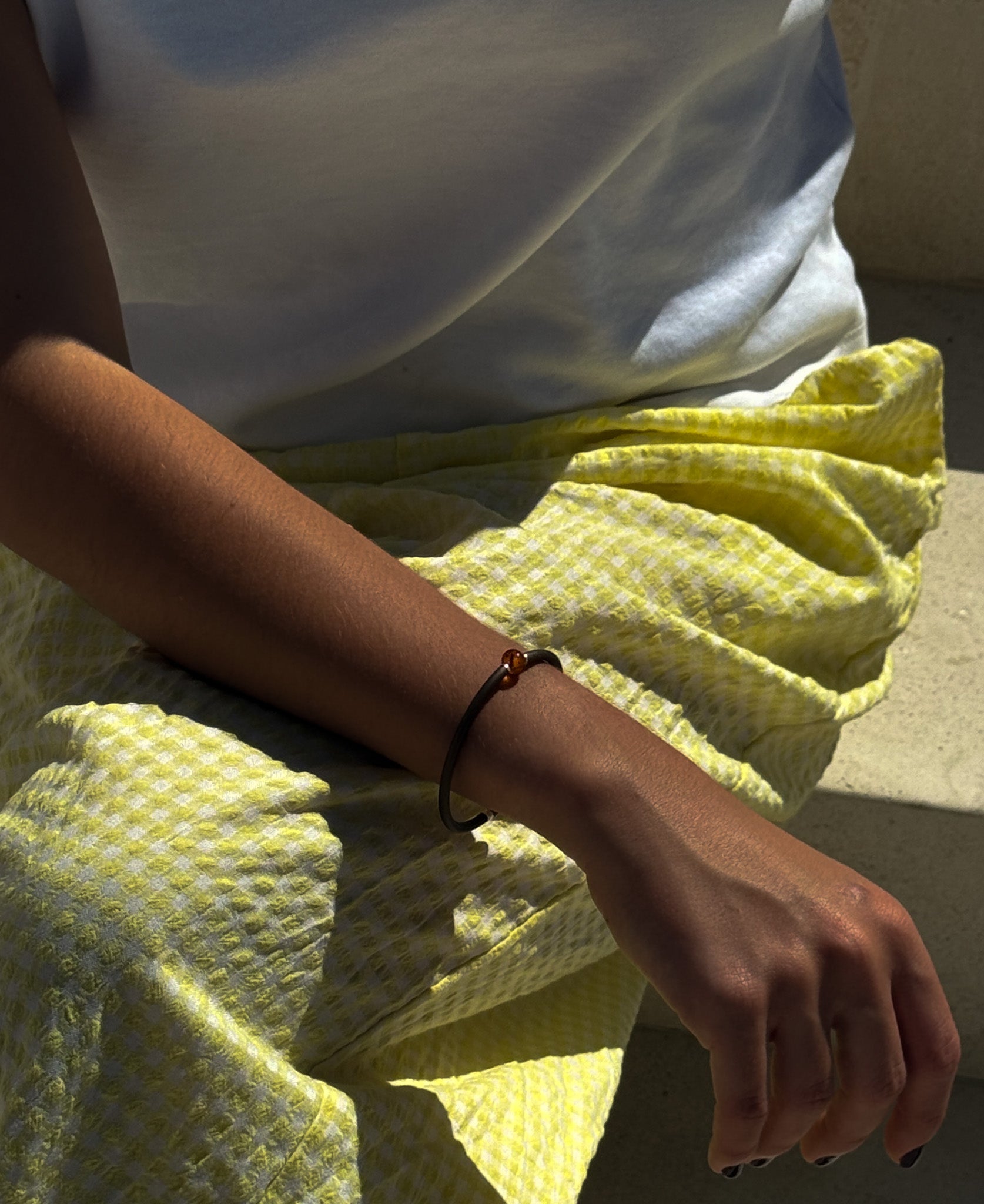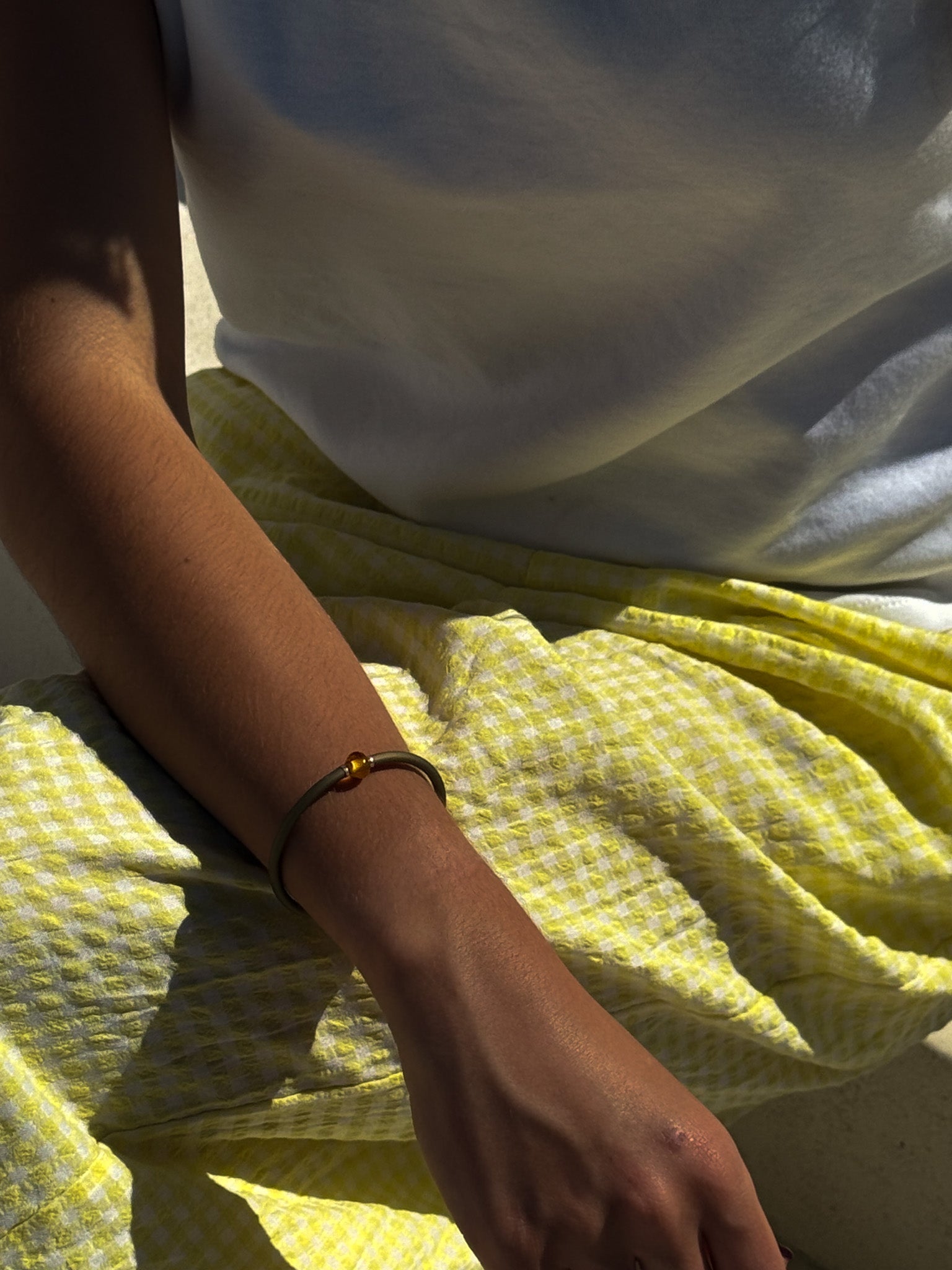 Pulsera de caucho elástica, combinada con una esfera de ámbar. Acabados en plata.